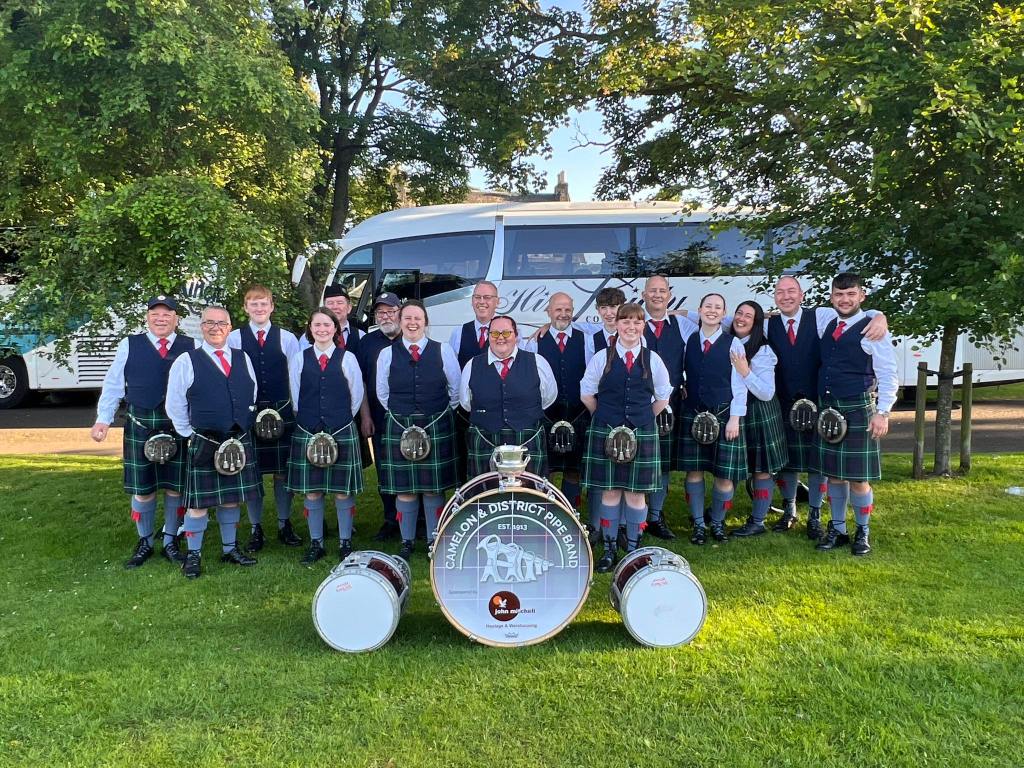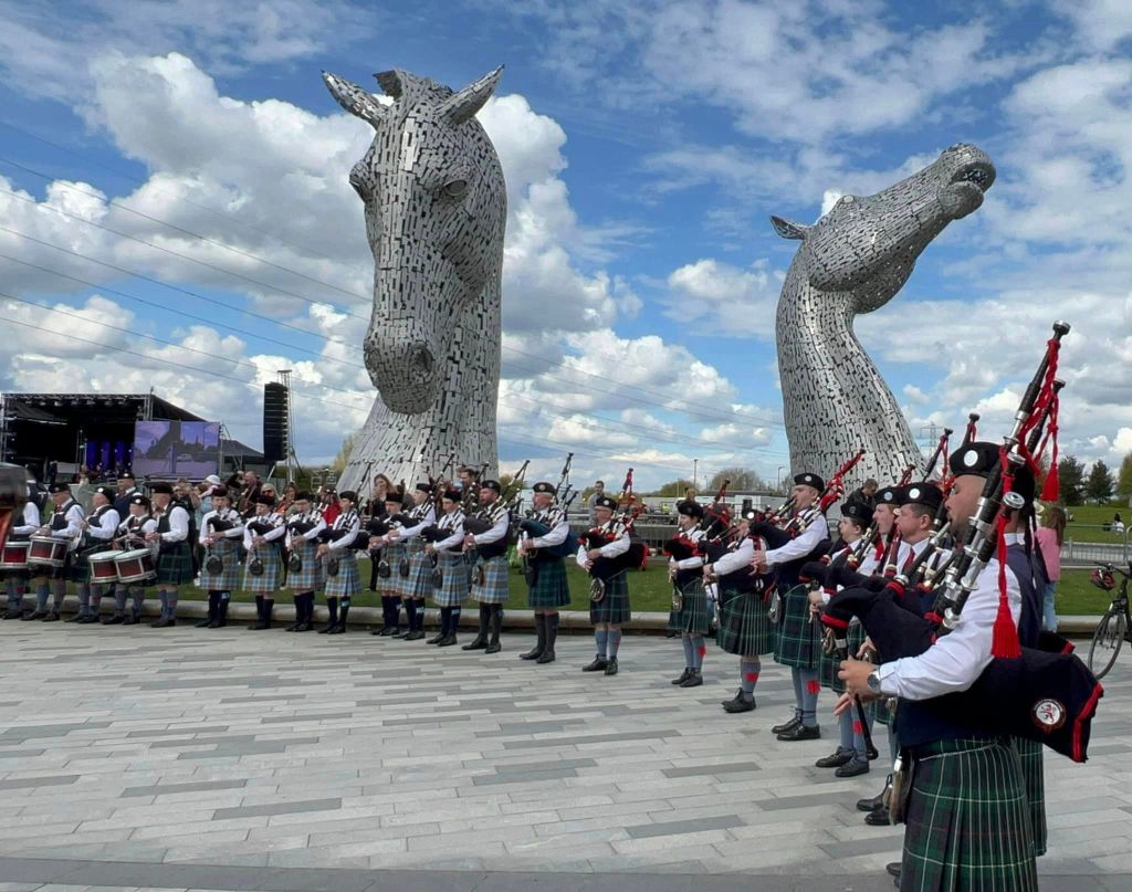 Camelon and District Pipe Band joined Wallacestone and Falkirk Schools to perform at the Kelpies’ 10th Anniversary celebrations.